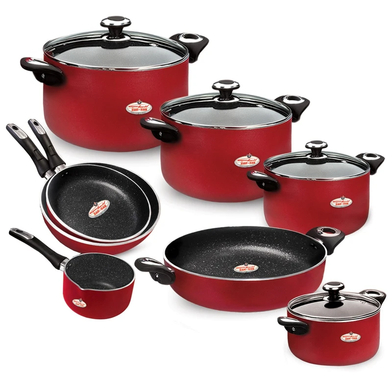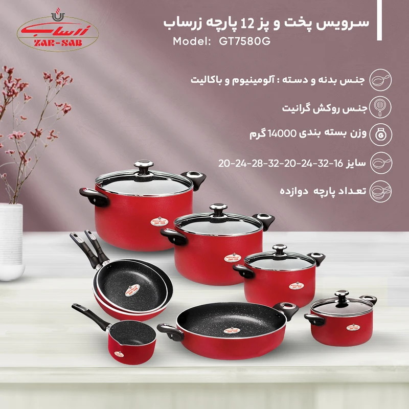 اگر برای تکمیل ظروف پختوپز آشپزخانهتان به دنبال یکست کامل و ماربردی هستید. سرویس 12 پارچه «زرساب» مدل «GT7580G» یک سرویس کامل برای تهیه و طبخ انواع غذاها در منزل است. این سرویس شامل چهار قابلمه با درپوش شیشهای و رینگ فلزی با سایزهای 32، 28، 24 و 20 سانتیمتر است. در کنار اینها، دو تابه تکدسته با سایز 20 و 24 سانتیمتر، یک تابه دو دسته سایز 32 و یک شیرجوش با سایز 16سانتیمتر است. جنس بدنه سرویس آلومینیوم و پوشش 5 لایه گرانیت دارد که نچسب بوده و شستوشوی راحتی نسبت به بقیه ظروف دارد. در این سرویس پختوپز توزیع حرارت درظروف کاملا یکنواخت بوده که بهترین نتیجه پخت را برای شما فراهم میکند. شفاف بودن درپوش به شما اجازه میدهد تا روند پخت غذا را بهراحتی مشاهده کنید، این درپوش دارای یک سوپاپ هستند که بخار داخل ظرف را به بیرون منتقل میکند. دسته و قپهها نیز از جنس باکالیت است که مقاوم در برابر حرارت بوده تا هنگام استفاده به راحتی و بدون داغ شدن آنها را جابجا کنید.